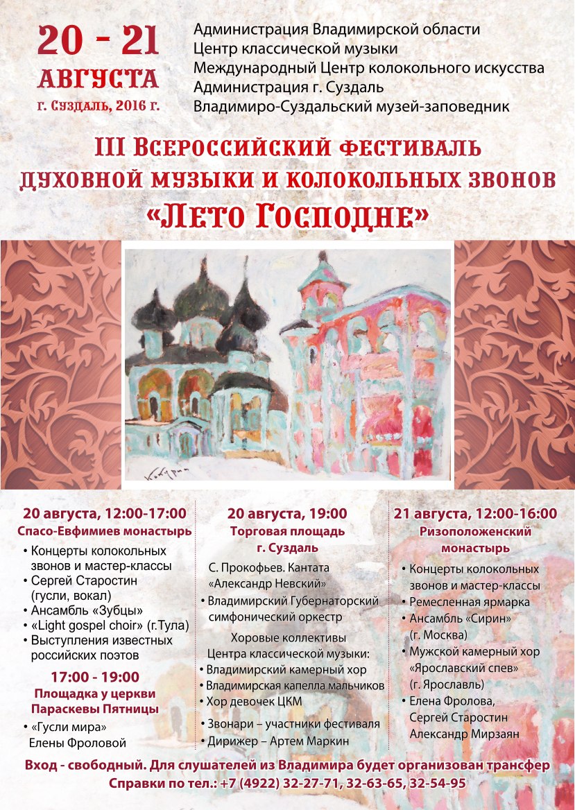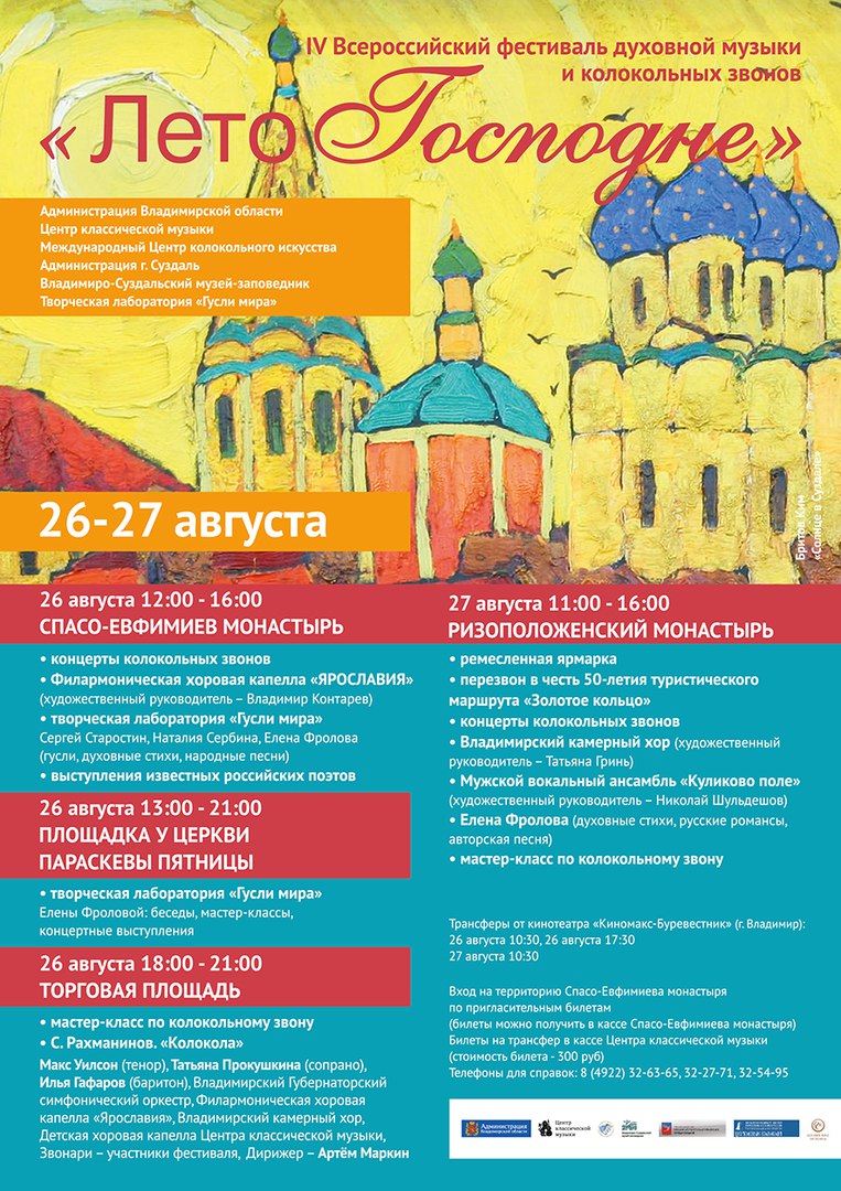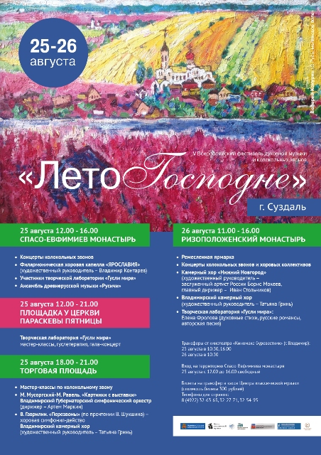 В рамках фестиваля состоятся концерты колокольных звонов, мастер-классы по колокольному звону и выступления творческих коллективов. Организаторы фестиваля – Администрация Владимирской области, Центр классической музыки, Международный центр колокольного искусства и Администрация г. Суздаль. Имя фестивалю дал знаменитый роман «Лето Господне» писателя Ивана Шмелева, судьба которого была связана с Владимирской землей. В этом году фестиваль проводится памяти российского живописца, народного художника Российской Федерации и нашего земляка Валерия Кокурина. Работы этого мастера уже который год украшают афиши фестиваля «Лето Господне». Колокола вновь зазвучат над Суздальской землей со звонницы самой высокой колокольни города – колокольни Ризоположенского монастыря. В этом году это прекрасное место будет радовать глаз гостей фестиваля оба дня. В шестом фестивале примут участие звонари из Архангельска, Волгограда, Москвы, Нижнего-Новгорода, Калуги, Череповца, Костромы, Иваново, Суздаля, а также из Вильнюса (Литва). 24 августа фестиваль откроется в 12:00. Здесь, помимо концертов колокольных звонов и мастер-классов, гостей фестиваля ожидает специальная программа от Владимирской капеллы мальчиков и юношей под управлением народного артиста России Эдуарда Маркина. Коллектив исполнит произведения Сергея Рахманинова, Петра Чайковского, Сергея Танеева и других русских композиторов. Вечерняя программа фестиваля переместится на Торговую площадь, где с 17:00 до 18:00 любой желающий сможет принять участие в мастер-классе по колокольным звонам от звонарей-участников фестиваля. Завершится вечер концертом, программа которого была специально подготовлена коллективами Центра классической музыки. В 18:00 Губернаторский симфонический оркестр, Владимирский камерный хор (художественный руководитель – Татьяна Гринь), солистка Центра классической музыки Светлана Балашова и актер Владимирского академического театра драмы Александр Аладышев под управлением Артема Маркина исполнят «Три русские песни для хора и оркестра» Рахманинова и «Поэторию» Щедрина. Программа фестиваля 25 августа вновь переместится на территорию Ризоположенского монастыря, где в 11:00 начнет работать ремесленная ярмарка, а с 12:00 начнется концертная программа. На ярмарке свои изделия представят мастера из разных уголков Владимирской области; в концертной программе состоятся концерты колокольных звонов и выступления хоровых коллективов, среди которых Сводный хор Центра классической музыки под управлением Татьяны Гринь. В рамках национального проекта «Культура» при поддержке Министерства культуры Российской Федерации в фестивале примет участие вокальный ансамбль «Intrada» (г. Москва, художественный руководитель – Екатерина Антоненко). Настоящим событием на шестом фестивале «Лето Господне» станет рождение колокола, в котором примут участие все желающие. Так называемую «народную плавку колокола» организуют истинные мастера своего дела – «Вольгинский Колоколец». Они убеждены, что величавая красота и мощь звучания колокола вновь будет символом России. Вход свободный. Для владимирских слушателей от Театральной площади будут организованы трансферы в Суздаль на программы фестиваля «Лето Господне». Билеты на трансфер в кассе Центра классической музыки (стоимость бил