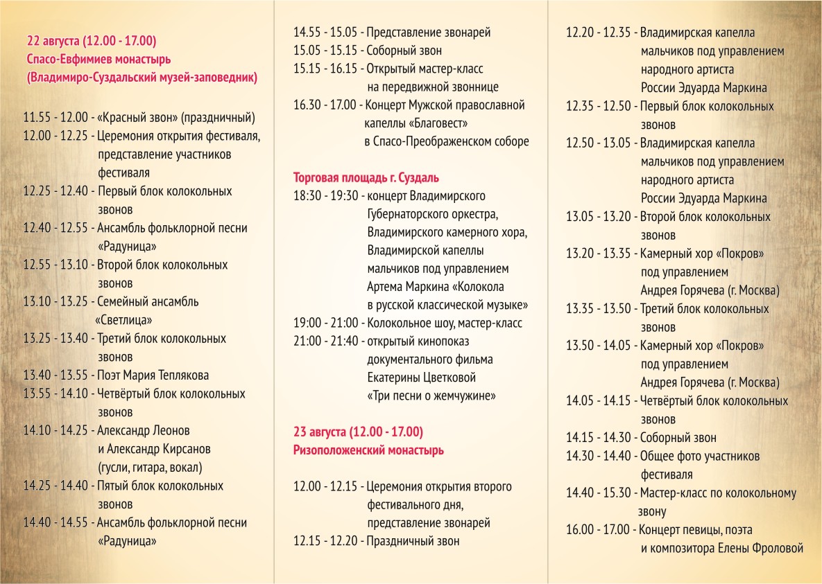 Программы колокольных звонов и выступления творческих коллективов в течение двух фестивальных дней состоялись в Спасо-Евфимиевом и Ризоположенском монастырях. Среди участников фестиваля – Владимирская капелла мальчиков и юношей под управлением народного артиста России, профессора Эдуарда Маркина, Камерный хор «Покров» под управлением Андрея Горячева, фольклорный ансамбль «Радуница», Хоровая капелла «Благовест», дуэт «Светлица», гусляры Александр Леонов и Александр Кирсанов, поэт Мария Теплякова и певица Елена Фролова.